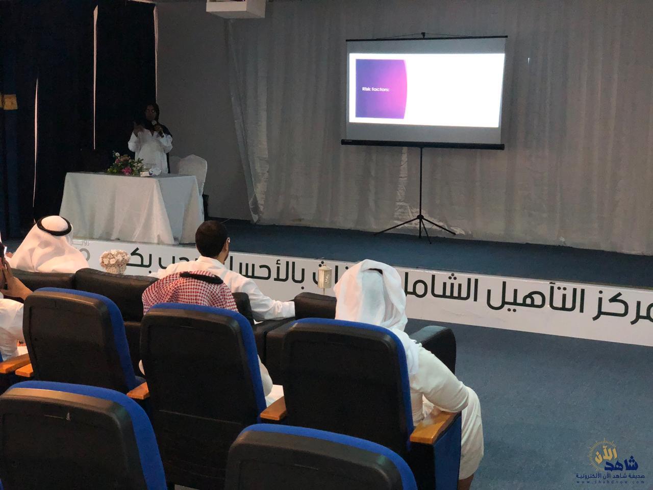 وبحضور سعادة مدير مركز التأهيل الشامل للذكور أ/ عبدالله المسعود ، و سعادة مديرة مركز التأهيل الشامل للإناث أ/ فاطمه اليعقوب ، وبحضور عدد من منسوبي ومنسوبات المركز من ممرضين وأخصائيين ومراقبين وفنيي العنايه الشخصيه وأشتملت المحاضرة على تعريف قرح الفراش و أنواعها والوضعيات الصحيحة لحالات طريحي الفراش ومدى تأثير مرض السكر والضغط عليهم وشرح كيفية طرق العلاج و تنظيف القرح وأهمية العناية بنظافة الجلد لتجنب التقرحات وأهمية تعقيم الأدوات قبل الاستعمال وأكدت الدكتورة على أهمية التغذية السليمة لما لها دور كبير في الحد من الاصابة بالتقرحات وفي الختام فتح مجال للحوار والمناقشة و طرح الأسئلة وأخيراً كرمت إدارة المركز الدكتورة بشهادة شكر وتقدير نظيراً لما قدمته .