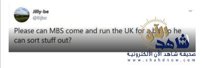 وكتب المواطن البريطاني بالمُعرف “Jilly-be”، متوجهاً بطلبه لولي العهد: “أرجوك..هل يمكن لمحمد بن سلمان المجيء وإدارة المملكة المتحدة لبعض الوقت، وترتيب الأمور وإعادتها لنصابها؟”.