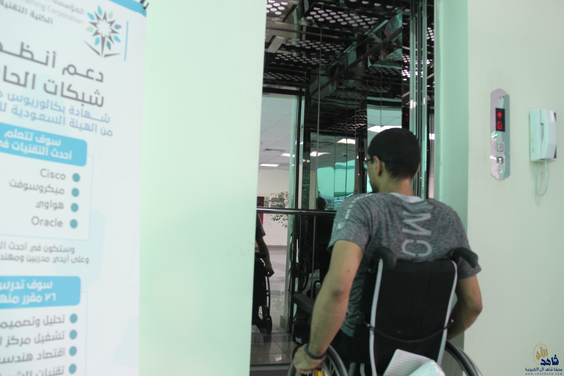 انتهت الكلية التقنية بالأحساء من توفير وتركيب ( 6 ) مصاعد في الأقسام والمباني التي يستخدمها الأشخاص ذوي الإعاقة من المتدربين وكذلك تجهيز ممرات ومنحدرات ومواقف سيارات إضافية، وذلك تسهيلاً لهم للوصول إلى المحاضرات في القاعات التدريبية والمعامل والمختبرات .