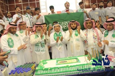 من جانبه أشار مدير العلاقات العامة والإعلام وليد بن محمد الشويهين بأن الكلية اكتست باللون الأخضر ابتهاجاً باليوم الوطني ، حيث تم تزيين جميع مرافق الكلية بأعلام المملكة وصور خادم الحرمين الشريفين الملك سلمان بن عبدالعزيز وولي العهد صاحب السمو الملكي الأمير محمد بن سلمان بن عبدالعزيز حفظهم الله ،وتوزيع الأعلام والوشاحات والباجات الخاصة لهذه المناسبة على المتدربين والمدربين ، كما تم عرض فيلم مرئي أعد خصيصاً لهذه المناسبة الغالية ، وكذلك اللوحات التعبيرية عن حب الوطن في مداخل الكلية ، كما تم إقامة مسابقة أجمل سنابه وأجمل تغريدة في حب الوطن وإطلاق وسم #همتنا_ماراح_توقف ونشر المشاركات الوطنية تحت هذا الوسم الذي تفاعل معه كثيراً من المشاركين ، كما شارك الجميع بتقطيع وتناول الكيكة الخاصة لهذه المناسبة.