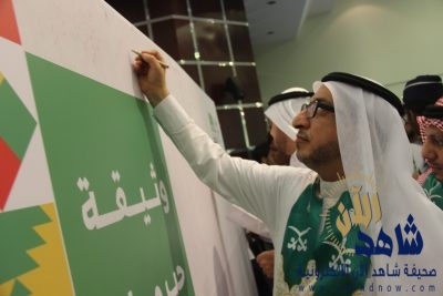 وأكد اليمني بان الاحتفال في هذه المناسبة والتي تقام كل عام تأتي كواجب وطني لتعزيز الحب والولاء للوطن، وأن مشاركة الكلية في عدد من الفعاليات داخل وخارج الكلية احتفاءً بذكرى يوم الوطن وتوحيده على يد المؤسس الملك عبد العزيز بن عبدالرحمن آل سعود طيب الله ثراه , جاءت بتوجيهات معالي محافظ المؤسسة العامة للتدريب التقني والمهني الدكتور أحمد بن فهد الفهيد، ومتابعة نائب المحافظ للتدريب الدكتور راشد الزهراني ومدير عام التدريب التقني والمهني بالمنطقة الشرقية الأستاذ محمد السلوم، بعدها قام اليمني بالتوقيع على وثيقة “حب وانتماء” بعده قام المشاركين بالتوقيع والتعبير عن حب الوطن.