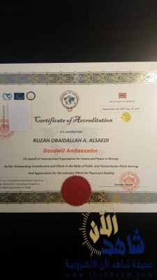 اختارت المنظمة الدولية للعدالة والسلام في مملكة النرويج المعتمدة من هيئة الأمم المتحدة الشاعرة والإعلامية السعودية: روز العبدالله سفيرةً للنوايا الحسنة في العالم تتويجاً لعطائها الثقافي والاعلامي خلال ٢٠ عاماً ما بين انتاجٍ شعري وثقافي وإعلامي والمشاركة في برامج إذاعيةٍ وتلفزيونيةٍ وتعاون في إعداد صفحاتٍ أدبيةٍ في صحفٍ ومجلاتٍ سعوديةٍ وخليجية تُعنى بالشعر الشعبي والتغطيات الإعلامية على الصعيد المحلي والعربي ، وكذلك مساهماتها التطوعية في أكثر من مؤتمر دولي لذوي الإعاقة والتطوع لتفعيل مشروع كيف نكون قدوة وأخيراً قيادة اللجنة الثقافية الشبابية التطوعية النسائية بمحافظة رابغ والعديد من الأعمال التطوعية على الصعيد الدولي والعربي والمحلي