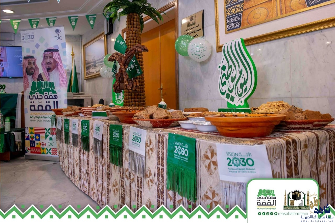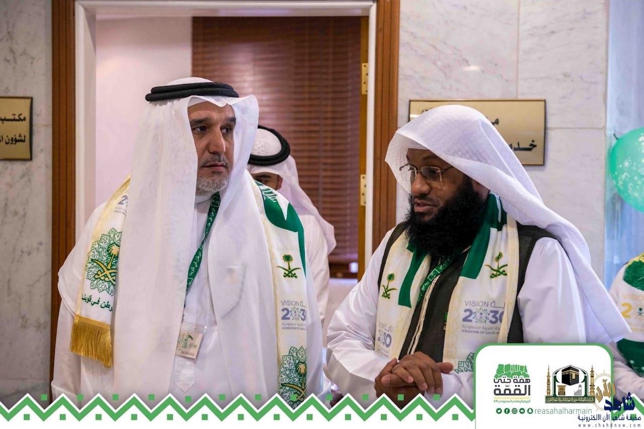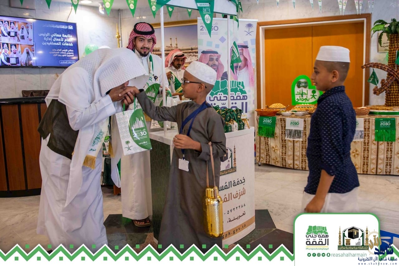 وقام سعادته بتدشين مبادرة فرحة وطن (همة حتى القمة) بمقر خدمات المستفيدين بالرئاسة العامة لشؤون المسجد الحرام والمسجد النبوي، كما تم استقبال زوار بيت الله الحرام وتقديم الهدايا العينية لهم، إضافة لضيافة تحوي العديد من الأكلات الشعبية السعودية .