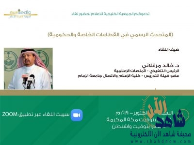 يلتقي أعضاء الجمعية الخليجية للأعلام “GAM” وضمن لقائهم الشهري في محاضرة بعنوان ” المتحدث الرسمي في القطاعات الخاصة والحكومية ” يتحدث خلالها ضيف اللقاء الرئيس التنفيذي للمنصات الإعلامية عضو هيئة التدريس في كلية الاعلام والاتصال بجامعة الامام محمد بن سعود الإسلامية الدكتور خالد محمد جمال مرغلاني وذلك مساء اليوم السبت الـخامس من أكتوبر الجاري 2019 وسيكون اللقاء من الرياض ويبث “اون لاين ” عبر تطبيق ZOOM وينطلق في تمام العاشرة بتوقيت مكة المكرمة ولمدة ساعه ، من 3-4 عصرا بتوقيت العاصمة واشنطن ، ووجهت الجمعية الدعوة لكافة المتابعين والمهتمين والمتخصصين وطلاب الاعلام والاكاديميين متمنية للجميع الفائدة