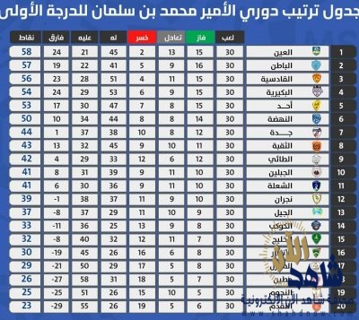 واصل فريق العين الأول لكرة القدم صدارته لفرق دوري الأمير محمد بن سلمان لأندية الدرجة الأولى لكرة القدم رغم تعادله مع الكوكب سلبياً على أرضه ورفع رصيده إلى 58 نقطة لكنه لم يقدم مستواه قبل التوقف إذ تعادل مرتين على أرضه وبات مهدداً بضياع الصدارة في حين تعادل وصيفه الباطن مع نجران في نجران بهدف لكل منهما وارتفع رصيده إلى سبع وخمسين نقطة وحقق القادسية فوزاً مهماً على جاره الثقبة بهدف يتيم وبات هو المستفيد من تعادل المتصدر والوصيف إذ قفز بنقاطه إلى 56 نقطة مقلصاً الفارق ومقترباً من المتصدر بفارق نفطتين ليصبح خطراً على الإثنين والجولات الثمان القادمة ربما تشهد تنافساً مثيراً بين الثلاثي ويدخل معهم البكيرية الذي وصل للنقطة 54 بعد تجاوزه للنهضة بهدف هداف الدوري الحاج عثمان باري وكذلك أحد الذي فاز على الجيل بالأحساء 2ـ صفر، فيما تجمد رصيد النهضة عند الخمسين نقطة لكنه لا يزال في جو المنافسة على الصعود.