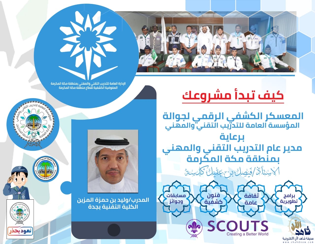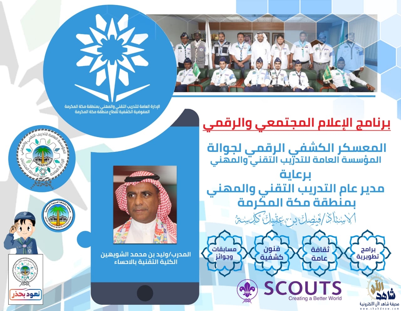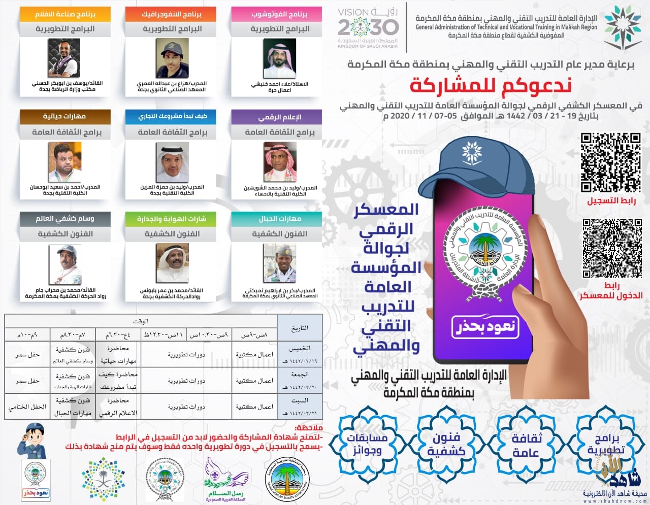 تنظم الإدارة العامة للتدريب التقني والمهني بمنطقة مكة المكرمة خلال الفترة من 19 – 21 من شهر ربيع الأول الجاري ، فعاليات المعسكر الكشفي الرقمي لجوالة المؤسسة العامة للتدريب التقني والمهني .