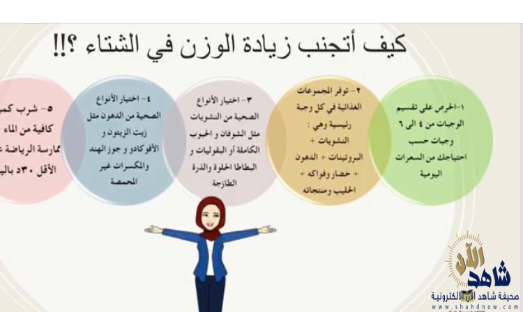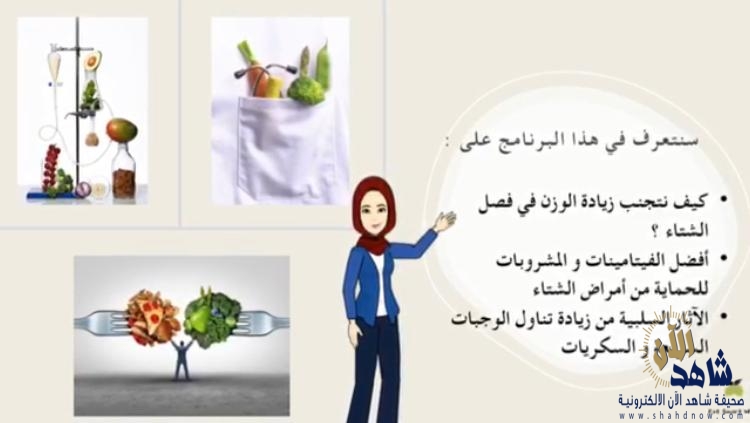 في برنامج غذائي نفذته وحدة الحماية الاسرية بالأحساء التابعة لوزارة الموارد البشرية والتنمية الاجتماعية مؤخراً لمستضافاتها وكادرها الوظيفي والمجتمع عبر وسائل التواصل الاجتماعي “الواتساب”بعنوان”صحتي في غذائي” تناولت أخصائية التغذية زينب بوناجمه ومع قرب فصل الشتاء الحديث عن كيفية نتجنب زيادة الوزن في فصل الشتاء بتناول الوجبات الرئيسة الغير مشبعة بالدهون والصحية والمتكاملة غذائياً وتطرقت لأفضل الفيتامينات خصوصاً فيتامينcوالمشروبات الدافئة التي ينصح بالإكثار منها في هذا الفصل البارد .