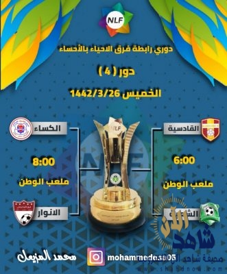 تأهلت فرق القادسية والكساء والشعبة والأنوار إلى الدور الرباعي من مسابقة دوري رابطة فرق الأحياء بالأحساء بعد ان فاز القادسية على الاستقلال بهدفين دون رد في دور الثمانية، والشعبة على السامبا بالركلات الترجيحية بثمانية أهداف مقابل سبعة، وتفوق الكساء على كاظمة بالركلات الترجيحية، والأنوار على العرين بخمسة مقابل أربعه أهداف بالركلات الترجيحية، وسوف يقام لقائي الدور الرباعي مساء يوم غد الخميس، حيث سيلتقي القادسية مع نظيره الشعبة في الساعة السادسة، واللقاء الثاني سيجمع بين فريقي الكساء والأنوار على ملعب الوطن عند الساعة الثامنة مساء.