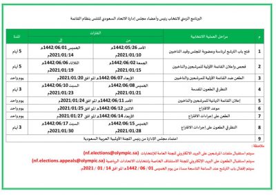 عقد مجلس إدارة الاتحاد السعودي للتنس اجتماعاً برئاسة الأستاذ محمد بن ناصر العجاجي، حيث شهد الاجتماع اعتماد النظام الأساسي للاتحاد، ولائحة الانتخابات، واللجنة العامة للانتخابات ولجنة الاستئناف، وتشكيل أعضاء الجمعية العمومية الأولى للاتحاد، والتي ستعقد يوم الاثنين ٢٥ يناير الجاري، كما تم اعتماد البرنامج الزمني لإنتخاب رئيس وأعضاء مجلس إدارة الإتحاد للدورة القادمة، حيث سيفتح باب الترشح من ١٠ – ١٤ يناير، ثم إعلان القائمة الأولية للمرشحين والناخبين من ١٥- ١٩ يناير، الطعن ضد القائمة الأولية يوم ٢٠ يناير، النظر في الطعون من ٢١ – ٢٣ يناير، ثم إعلان القائمة النهائية يوم ٢٤ يناير، موعد الاقتراع ٢٥ يناير، والطعن على إجراءات الاقتراع ٢٧ يناير، النظر في الطعون ٢٨ – ٣٠ يناير، وتنتهي باعتماد مجلس الادارة من رئيس اللجنة الأولمبية العربية السعودية.