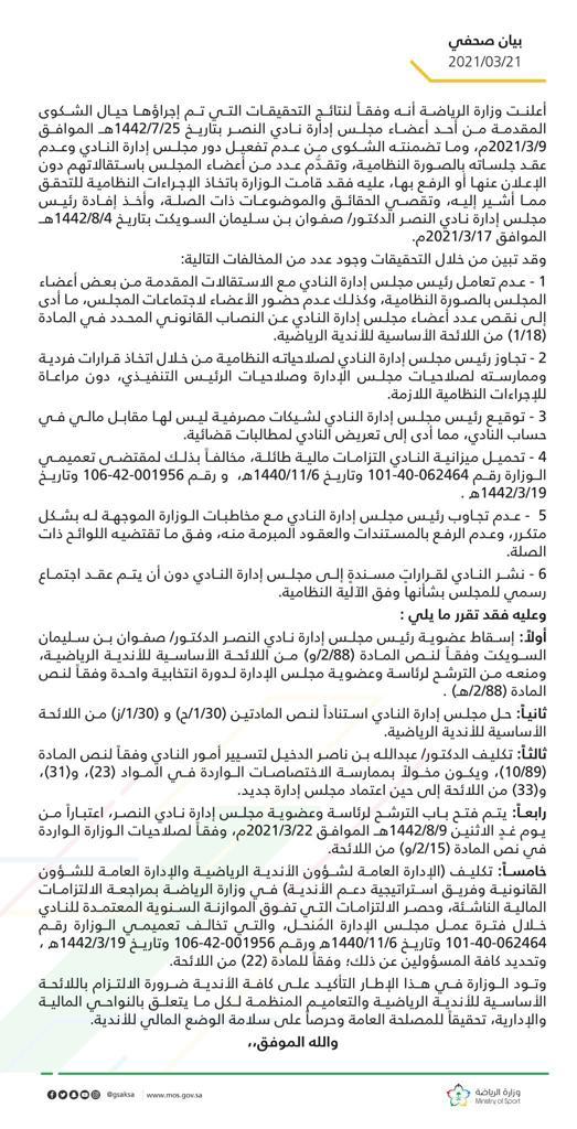 أعلنت وزارة الرياضة أنه وفقاً لنتائج التحقيقات التي تم إجراؤها حيال الشكوى المقدمة من أحد أعضاء مجلس إدارة نادي النصر بتاريخ 25/7/1442هـ الموافق 9/3/2021م، وما تضمنته الشكوى من عدم تفعيل دور مجلس إدارة النادي وعدم عقد جلساته بالصورة النظامية، وتقدُّم عدد من أعضاء المجلس باستقالاتهم دون الإعلان عنها أو الرفع بها، عليه فقد قامت الوزارة باتخاذ الإجراءات النظامية للتحقق مما أشير إليه، وتقصي الحقائق والموضوعات ذات الصلة، وأخذ إفادة رئيس مجلس إدارة نادي النصر الدكتور صفوان بن سليمان السويكت بتاريخ 4/8/1442هـ الموافق 17/3/2021م.