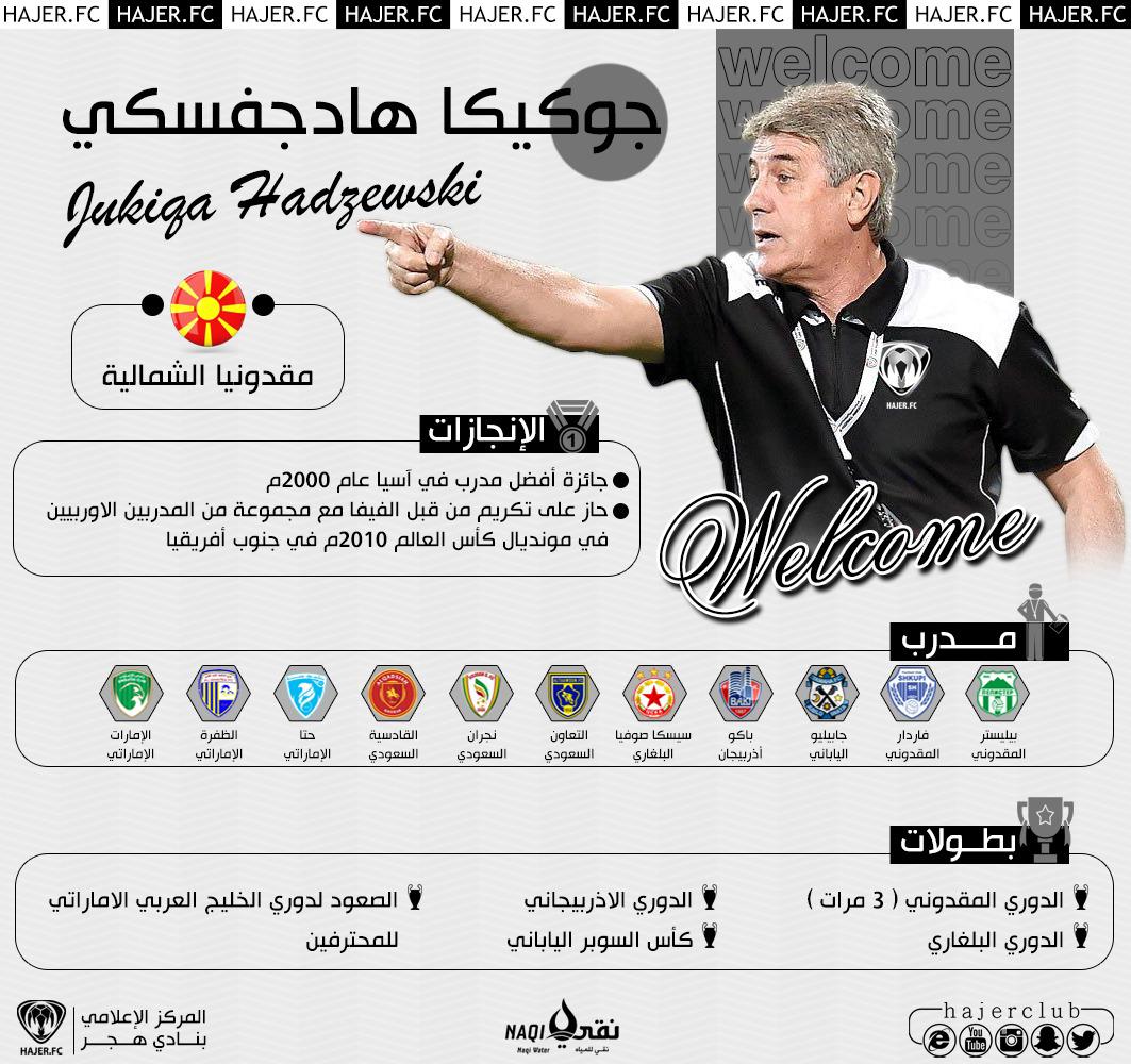 أنهت إدارة نادي هجر برئاسة الاستاذ حمد العريفي إجراءات التعاقد مع المدرب المقدوني “جوكيكا هادجفسكي” بعقد لمدة عام ليتولى قيادة الفريق الهجراوي في دوري الأمير محمد بن سلمان للدرجة الأولى في موسم ٢٠٢١-٢٠٢٢م .