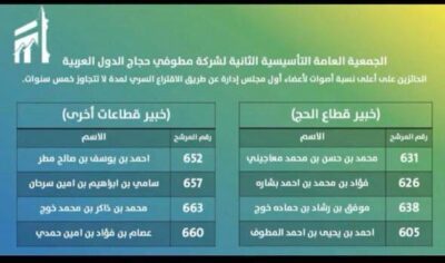 أعلنت اللجنة المشرفة على الانتخابات للشركة الأهلية لحجاج الدول العربية عن قائمة الفائزين بثقة الناخبين عبر الاقتراع السري الذي أجرى مؤخرا بمتابعة وزارة الحج والعمرة