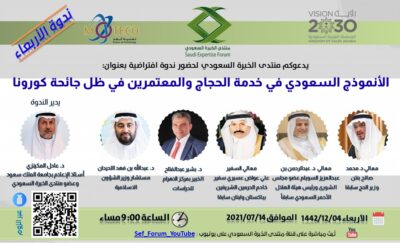 ينظم منتدى الخبرة السعودي ضمن نشاطه الأسبوعي ندوة بعنوان (الأنموذج السعودي في خدمة الحجاج والمعتمرين في ظل جائحة كورونا) يشارك فيها: معالي الدكتور محمد بن صالح بنتن وزير الحج سابقا ومعالي الدكتور عبدالرحمن بن عبدالعزيز السويلم عضو مجلس الشورى ورئيس هيئة الهلال الأحمر السعودي سابقا ومعالي السفير الأستاذ علي عواض عسيري سفير خادم الحرمين الشريفين في باكستان ولبنان سابقا والدكتور بشير عبدالفتاح من مركز الإهرام للدراسات من جمهورية مصر الشقيقة والدكتور عبدالله بن فهد اللحيدان مستشار وزير الشؤون الإسلامية و يديرها الدكتور عادل بن عبدالقادر المكينزي أستاذ الإعلام المشارك بجامعة الملك سعود وعضو المنتدى وذلك من خلال برنامج زوووم (ZOOM) يوم الاربعاء القادم 4 ذو الحجة 1442 الموافق 14 يوليو 2021م الساعة 9 مساء وسوف تنقل مباشرة على قناة المنتدى في اليوتيوب