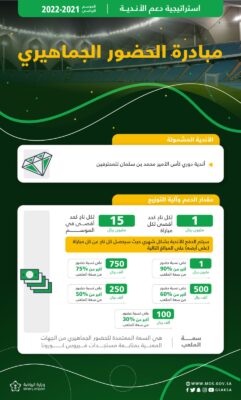 وتستمر مبادرة “الحضور الجماهيري” التي تشمل جميع أندية دوري كأس الأمير محمد بن سلمان للمحترفين، وذلك بهدف التحفيز لزيادة الحضور الجماهيري وتعزيز مشاركة المشجع بشكل فعال، حيث يمكن لكل نادٍ الحصول على مبلغ 15 مليون ريال سنويًّا للمباريات التي تقام على أرضه، كحد أقصى بواقع مليون ريال للمباراة الواحدة، وذلك وفقًا للنسب المحددة التالية:
