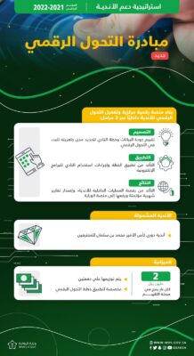 واستحدثت الوزارة في استراتيجية دعم الأندية الرياضية للموسم الحالي مبادرة “التحول الرقمي”، والتي ترتكز حول بناء منصة رقمية مركزية للوزارة، وتفعيل التحول الرقمي للأندية داخليًّا عبر ثلاث مراحل: