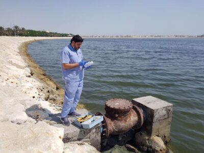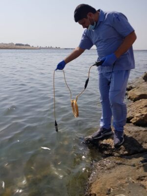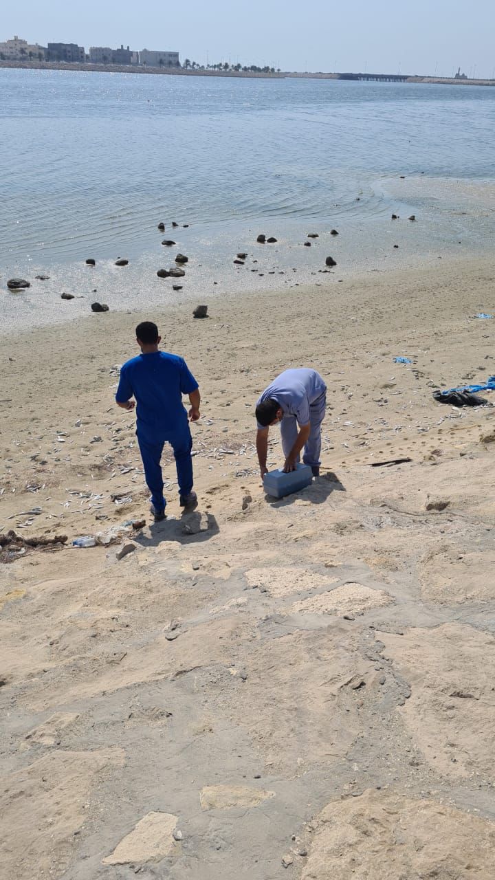 وقف فرع وزارة البيئة والمياه والزراعة بالمنطقة الشرقية ممثلاً بأخصائي الثروة السمكية بمركز أبحاث الثروة السمكية بمحافظة القطيف صباح أمس الأربعاء الموافق 8/9/2021 على كورنيش محافظة القطيف بعد تسجيل نفوق أسماك على منطقة منه.
