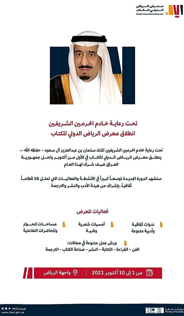تحت رعاية خادم الحرمين الشريفين الملك سلمان بن عبد العزيز آل سعود – حفظه الله -، ينطلق معرض الرياض الدولي للكتاب في الأول من أكتوبر القادم في “واجهة الرياض”، بمشاركة أهم دور النشر من مختلف دول العالم وستشهد الدورة الجديدة لمعرض الرياض الدولي للكتاب، الذي تشرف عليه هيئة الأدب والنشر والترجمة، توسعاً كبيراً في أنشطته وفعالياته المتنوعة؛ تمثل 16 قطاعاً ثقافياً. وتحل جمهورية العراق ضيف شرف المعرض لهذا العام.