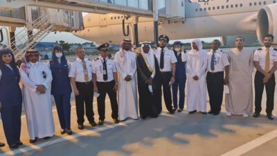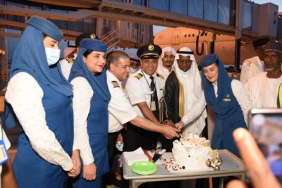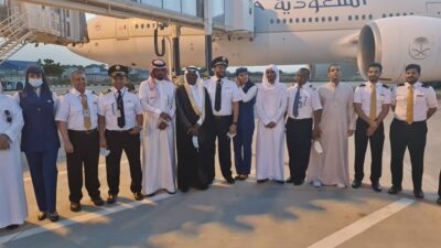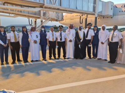 واقيم بهذه المناسبة احتفالا بساحه المطار بمشاركة قائد الطائرة محمد الشبونا ، والكابتن عبداللطيف الغامدي ، وطاقم الملاحة