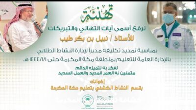 هنأ قسم النشاط الكشفي بالإدارة العامة للتعليم بمنطقة مكة المكرمة بقيادة رئيس القسم القائد الكشفي الأستاذ زياد قدير ، مدير إدارة النشاط الطلابي بالإدارة الأستاذ نبيل بن بكر طيب بمناسبة تمدير تكليفه بالعمل مديرا لإدارة النشاط الطلابي في تعليم مكة المكرمة حتى غرة محرم 1444ه، معربين في فخرهم واعتزازهم بتكليفه بهذه المهمة ، متمنين له التوفيق والسداد في عمله ، مثنيين على ما يبذله من جهود في خدمة النشاط الطلابي بالإدارة منذ تكليفه