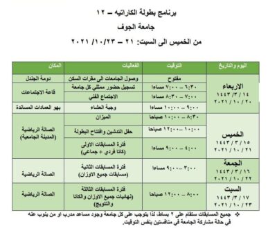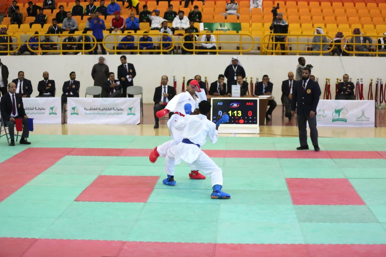 انطلقت اليوم الأربعاء بطولة الكاراتيه ضمن مسابقات الاتحاد الرياضي للجامعات السعودية والتي تستضيفها جامعة الجوف خلال الفترة 21 – 23 اكتوبر الجاري بمشاركة أكثر من 100 لاعب يمثلون 16 جامعة سعودية ، وذلك تحت رعاية معالي وزير التعليم الدكتور حمد آل الشيخ رئيس مجلس إدارة الاتحاد الرياضي للجامعات السعودية..