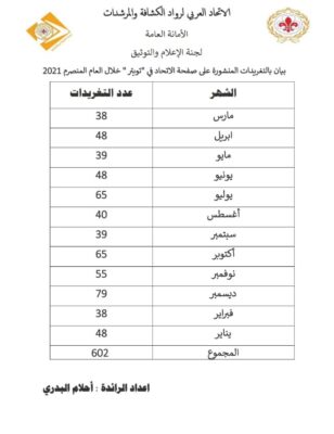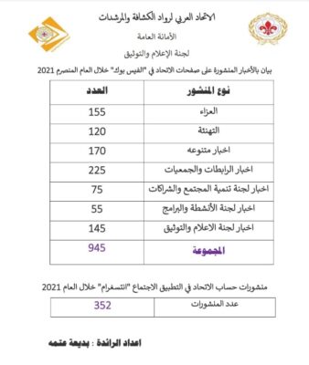 وكانت لجنة الاعلام والتوثيق بالاتحاد العربي لرواد الكشافة والمرشدات بقيادة ربانها الرائد علي العلي ونائبته الرائد منى عبدالقادر قد قدمت عملا احترافيا كبيرا خلال العام 2021 ، وبذل أعضاء اللجنة معه جهدا كبيرا ليقدموا عاما حافلا من العمل والجهد والبذل والعطاء ، وتنوعت برامجهم خلال العام وضمن جدول اعمال برامجهم