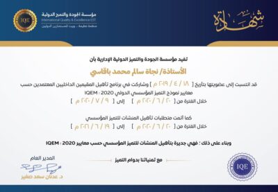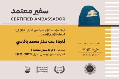 اجتازت عضو مؤسسة الجودة التمييز الدولية والإدارية الناشطة الاجتماعية الأستاذة نجاة سالم باقاسي ، برنامج تأهيل المقيمين الداخليين المعتمدين حسب معايير نموذج التمييز المؤسسي الدولي 2020 IQEM ، واتمت متطلبات تأهيل المنشآت للتميز المؤسسي ، ومنحت درجة “سفير معتمد”