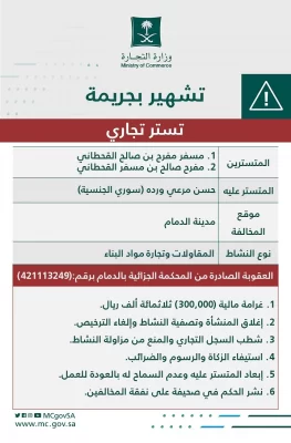 وأصدرت المحكمة الجزائية بالدمام حكماً قضائياً بفرض غرامة مالية 300 ألف ريال والتشهير بالمخالفين الثلاثة على نفقتهم، بالإضافة إلى العقوبات التبعية المقررة الأخرى وهي إغلاق المنشأة، وتصفية النشاط، وشطب السجل التجاري، والمنع من مزاولة النشاط التجاري، واستيفاء الزكاة والرسوم والضرائب، وإبعاد المتستر عليه عن المملكة وعدم السماح له بالعودة إليها للعمل.