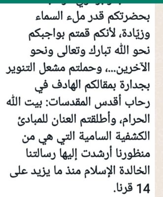 ومضى “الشنقيطي يقول: أرحب بحضرتكم أيها الزملاء في الكشافة السعودية قدر ملء السماء وَزِيَادَة، لأنكم قمتم بواجبكم نحو الله -تبارك وتعالى- ونحو الآخرين، وحملتم مشعل التنوير بجدارة بمقالكم الهادف في رحاب أقدس المقدسات: بيت الله الحرام، وأطلقتم العنان للمبادئ الكشفية السامية التي هي من منظورنا أرشدت إليها رسالتنا الخالدة الإسلام منذ ما يزيد على 14 قرنا.
