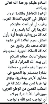 ووجه ” الشنقيطي ” رسالة معبرة إلى القادة والرواد في مجموعات التطبيق الاجتماعي “الواتساب” أكد خلالها متابعتهم لما تضمنه المقال المعنون بـــــ”عادت حمائم السلام إلى بيت الله الحرام” أنهم في رواد كشافة موريتانيا تابعوا باهتمام ما تضمنه المقال، مشيرا إلى أن عودة الكشافة للخدمة في البيت الحرام تعد بشارة يستبشر بها الجميع، موضحا أن المقال أثلج صدورهم في مشارق الأرض ومغاربها، وقال: نهتز لها طربا نحن رواد الكشافة في المنكب القصيّ من الوطن العربي: موريتانيا، لأننا ندرك بجلاء أن الواجب نحو الله والواجب نحو الآخرين قد قيم بهما على أحسن وجه من طرف نظرائنا في المملكة العربية السعودية، وهما من أهمّ مرتكزاتنا في الحركة الكشفية، فلا أعظم من خدمة حجاج بيت الله الحرام سواء في موسم الحج أو في غيره. الأمر الذي يضفي مصداقية لا تقدر بأي ثمن على دور الحركة الكشفية في تقديم الخدمة للإسلام والمسلمين.