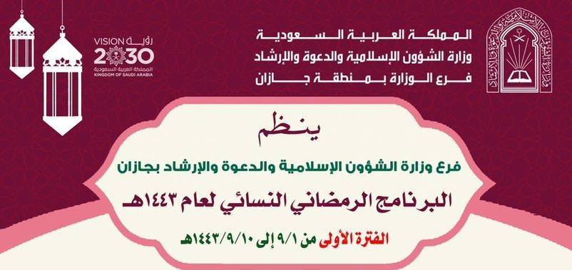 ينظم فرع وزارة الشؤون الإسلامية والدعوة والإرشاد في منطقة جازان ممثلاً بإدارة الشؤون النسائية البرنامج الدعوي النسائي لشهر رمضان لهذا العام ١٤٤٣هـ للفترة الأولى من بداية رمضان وحتى اليوم العاشر منه ، افتراضيا عن بُعد عبر التطبيق الاجتماعي “زووم”