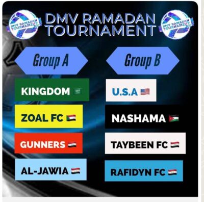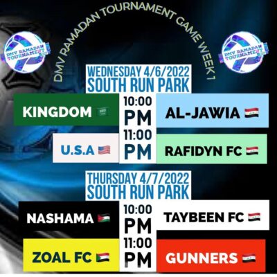 تنطلق مساء يوم غدا الأربعاء منافسات الجولة الأولى من مسابقة كرة القدم الرمضانية لمنطقة العاصمة وولايتي مريلاند وفريجين الأمريكية “DMV”، على ملاعب “South Run Park” جنوب ارلنتغتون القريب من العاصمة واشنطن، والذي يقام بتنظيم الجالية العراقية بإدارة السيد طيف العراقي