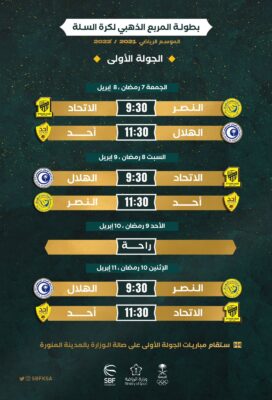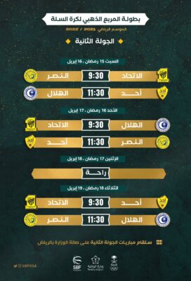 تشهد صالة وزارة الرياضة بالمدينة المنورة غدًا الجمعة انطلاق منافسات المرحلة الأولى من المربع الذهبي لكرة السلة بمشاركة الاربع الاوائل في الدوري (الهلال- النصر – الاتحاد- أحد) وتلعب على مرحلتين بالمدينة والرياض بحيث تلعب مباريات المرحلة الأولى والثانية من دور واحد ، وتحسم منافسات البطولة للفريق الأعلى نقاطًا في ختام المنافسات وفي حالة تعادل فريقين أو ثلاث فرق ينظر للمواجهات بينهما، وفي حالة التعادل في المواجهات ينظر لفارق نقاط التسجيل بين الفرق الثلاث ماله وعليه ، وفي حالة التعادل في نقاط التسجيل ينظر إلى فارق نقاط التسجيل ماله وعليه للفرق الأربع المشاركة في المربع الذهبي ، وفي حالة التعادل في النقاط يتم الحسم عن طريق القرعة ،وتعد هذه البطولة ختام بطولات الموسم الحالي بعد ختام بطولة الدوري وكأس وزارة الرياضة .