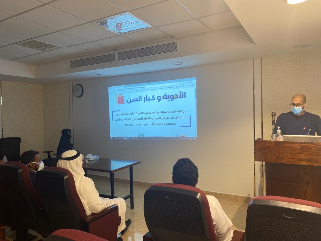وتحدث مسؤول التثقيف والإعلام الدوائي عن اهمية اخبار الطبيب والصيدلي عن جميع الادوية التي يستخدمها كبار السن سواء بوصفة طبية او بدون وصفة وكذلك المكملات العشبية والغذائية .