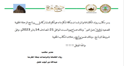 يُذْكَر أَنَّ مكتب رواد الكشافة والمرشدات بمكة المكرمة وضمن برامجه قد أعلن عن إقامة رحلة خلوية كشفية بالصعود إلى جبل النور، ووجه رقاع الدعوة إلى عدد من القطاعات الخاصة والعامة بالعاصمة المقدسة، وأعدت برنامجا مصاحبا للرحلة