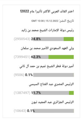 وحصل ولي العهد السعودي على (7 ملايين و399 ألفا و451 صوتا)، ما يشكل 62.3% من أصل (11 مليونا و877 ألفا و546 صوتا) شاركوا في الاستطلاع الذي بدأ في 15 ديسمبر الماضي وانتهى عند الساعة 24 من التاسع من يناير الحالي.