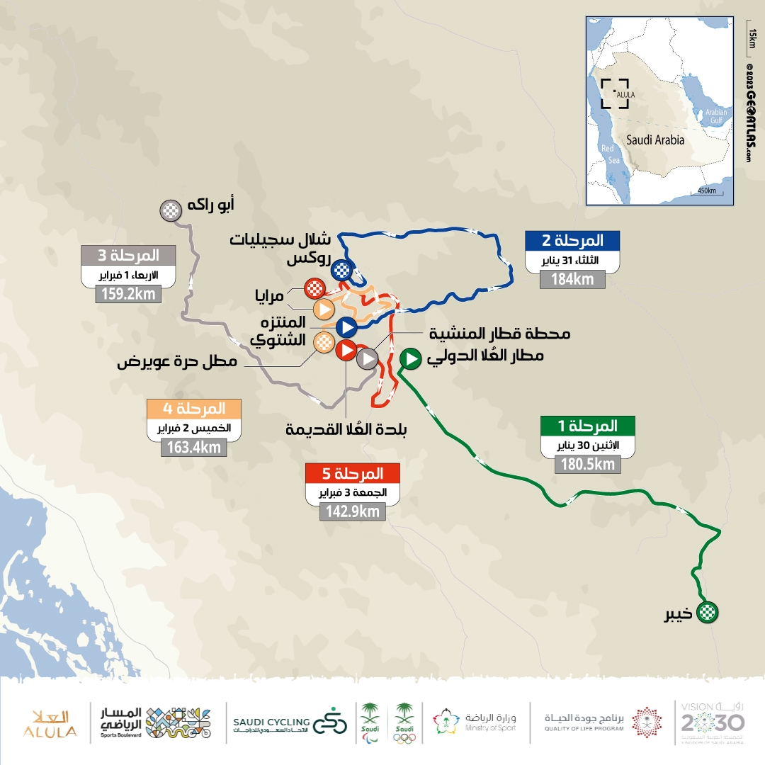 – المرحلة الخامسة تختتم من بلدة العُلا القديمة إلى مسرح مرايا، على امتداد 142,9 كلم.