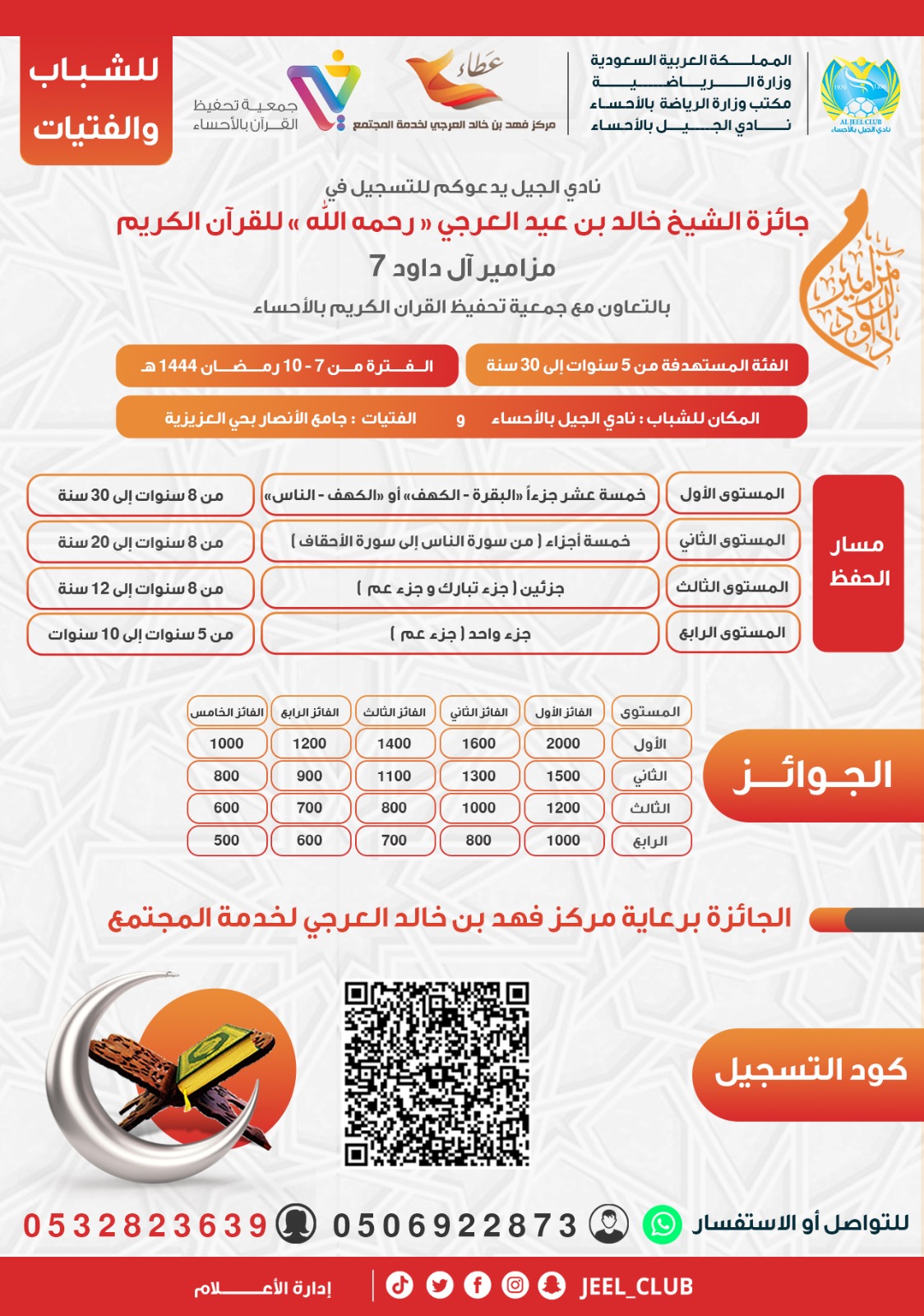 أعلن نادي الجيل بالأحساء عن بدء التسجيل في جائزة الشيخ خالد بن عيد العرجي “رحمه الله” للقرآن الكريم “مزامير آل داود” في نسختها السابعة للشباب والفتيات بالتعاون مع جمعية تحفيظ القرآن بالأحساء وبرعاية “عطاء” مركز فهد العرجي لخدمة المجتمع، ويستمر التسجيل حتى الخامس من رمضان 1444هـ على أن تنطلق فعاليات المسابقة خلال الفترة من 7 -10 / 9 /1444هـ عقب صلاة التراويح مباشرة في مقر النادي بحي الملك فهد للشباب أما الفتيات ستكون المسابقة في جامع الأنصار بحي العزيزية.
