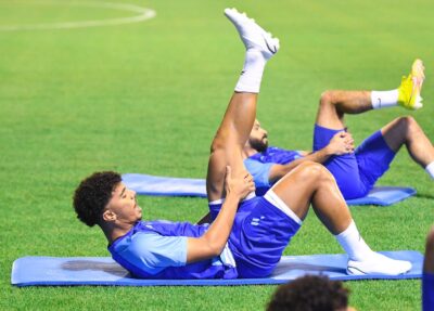 انطلقت التدريبات بعمليات الإحماء بعدها قسم الجهاز الفني اللاعبين إلى ثلاث مجموعات طبقت كل مجموعة تدريبات متنوعة من خلال المرور بين الأقماع والقفز على الحواجز.