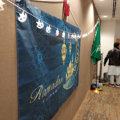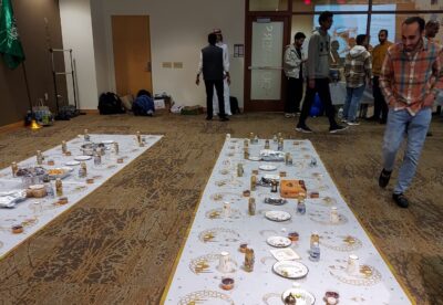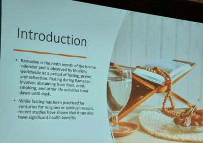 وأقيم بهذه المناسبة برنامج مصاحب بدأ بالتعريف به وقدمه المرافق ظافر السبيعي، أكد خلالها أن رمضان شهر يحتفل به المسلمون، مشيرا إلى عادات وثقافة الناس في المملكة العربية السعودية، مقدما شكره للمسؤولين في الجامعة، ثم قدم الطالب “عبد الملك” أحد أعضاء النادي عرضا تقديما عن فوائد الصيام لاقى استحسان الجميع، مشيرا إلى أن الصيام موجود في كل الأديان لكنه مختلف عند المسلمين