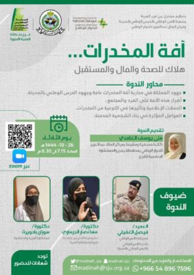 حيث تتناول الندوة التي يُشارك فيها مدير إدارة الأمن الوقائي بالحرس الوطني بالمدينة العميد فيصل الغفيلي وعضو هيئة التدريس بجامعة طيبة الدكتورة مها الجرماوي والمستشارة الأسرية والاجتماعية الدكتورة سوزان باحويرث، عدداً من المحاور حول جهود المملكة في محاربة آفة المخدرات عامة وجهود الحرس الوطني بالمدينة وأضرار هذه الآفة على الفرد والمجتمع والحملات الإعلامية وتأثيرها في التوعية من المخدرات والعوامل المؤثرة في بناء الشخصية المدمنة.