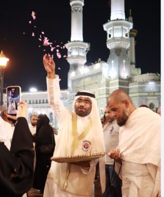 و أعتبر أول شخص يستقبل ضيوف الرحمن بالورد الطائفي في ساحة الحرم.