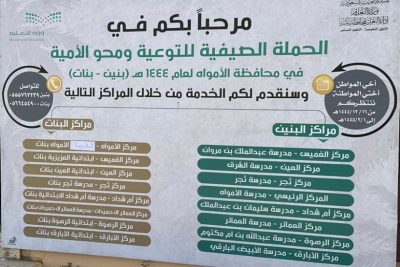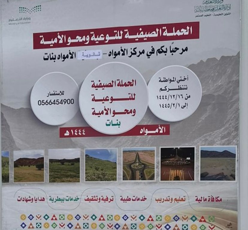استمرارًا للجهود المبذولة في الحملة الصيفية للتوعية ومحو الأمية بتعليم بيشة ، والتي تستمر 45 يومًا بقطاع الأمواه والتي تنفذ في 8 مراكز تابعة له ، حيث تنوعت البرامج التعليمية التي تقدم للدارسات وتستمر الحملة في تقديم العديد من البرامج والمبادرات النوعية لخدمتهم في الجوانب التعليمية من حيث تعليم المهارات الأساسية في المواد الدينية والعربية، إلى جانب مقدمة في مادة الرياضيات وغيرها من المواد، كذلك تتضمن الحملة فصولًا دراسية وبرامج تدريبية وترفيهية وخدمات عامة بمشاركة عدد من الجهات الحكومية.