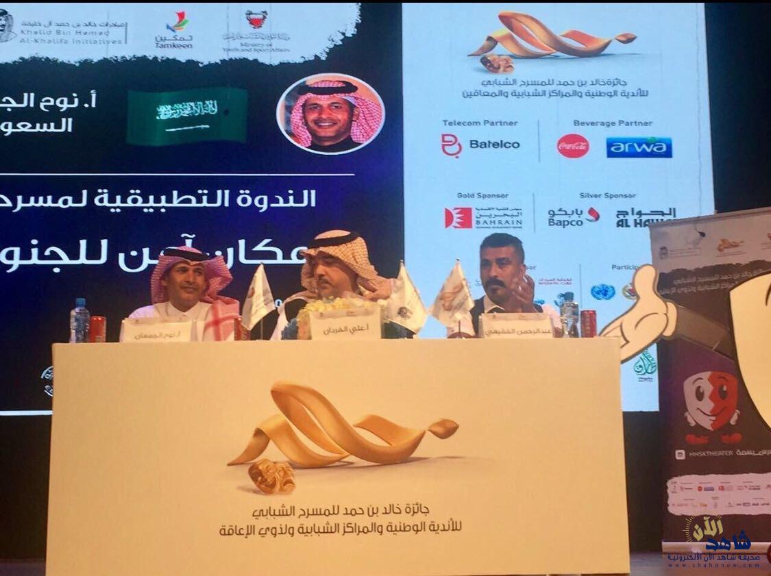 شارك يوم الأمس مشرف لجنة الفنون المسرحية بجمعية الثقافة والفنون بالأحساء المخرج المسرحي نوح الجمعان في التعقيب على العرض المسرحي البحريني (مكان آمن للجنون) للمخرج عبدالرحمن فقيهي وذلك ضمن عروض مهرجان جائزة خالد بن حمد لمسرح الشباب بمملكة البحرين حيث تناول الجمعان العرض من جميع النواحي الفنية مبيناً نقاط القوة والضعف فيه ومثنياً على أداء الممثلين فيما شكر إدارة المهرجان على إتاحة الفرصة له للمشاركة وفِي نهاية الندوة تم تكريم الجمعان من قبل إدارة المهرجان سلمها له الفنان البحريني عبدالله ملك ، ومن جهة أخرى يستعد المخرج المسرحي الأستاذ يوسف الخميس للمشاركة أيضا في التعقيب على عرض مسرحية (سيد الأختيار) للمخرج محمد علي وذلك يوم الجمعة القادم وضمن عروض المهرجان أيضا ، يذكر أن المهرجان يقدم نسخته الثالثه هذا العام و تقام عروضه المسرحية على مسرح النهام بمركز المحرق الشبابي النموذجي في الفترة من ٤ أكتوبر و إلى غاية ٢١ أكتوبر ٢٠١٧ م