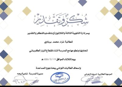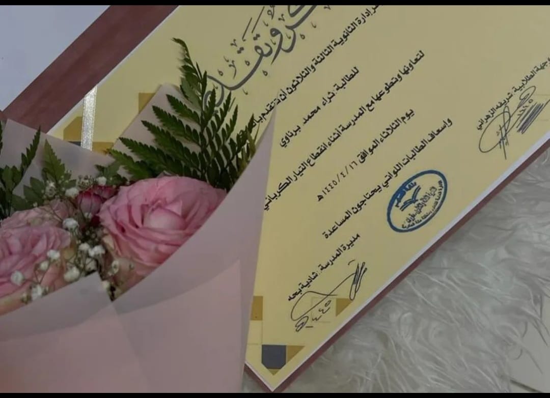 كرمت المربية الفاضلة شادية بحه قائدة المدرسة الثالثة والثلاثون الثانوية للبنات بضاحية الشرائع بمكة المكرمة الطالب ثراء محمد برناوي ، وذلك لموقفها الإنساني وتطوعها في المدرسة اثناء انقطاع التيار الكهربائي ضاربة أروع المثل في التعاون وإظهار ما تتميزن به طالبات المدرسة تحت أشراف مربياتهن مدير المدرسة وكادر الإدارة والمعلمات