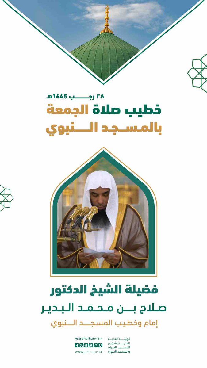 سيكون خطيب الجمعة بالمسجد النبوي ، فضيلة الشيخ الدكتور صلاح بن محمد البدير.