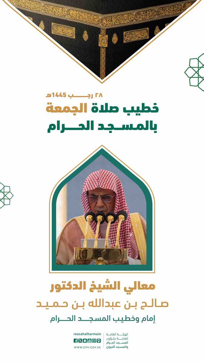 سيكون خطيب الجمعة بالمسجد الحرام ، معالي الشيخ الدكتور صالح بن عبدالله بن حميد.