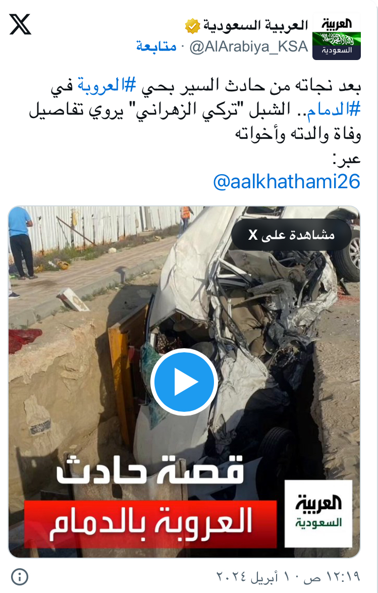 روى الطفل ” تركي أحمد الزهراني ” في لقاء مع قناة ” العربية السعودية” ، تفاصيل الحادث الذي تعرض له برفقة أسرته بحي العروبة في الدمام ، وأسفر عن وفاة والدته وشقيقاته.