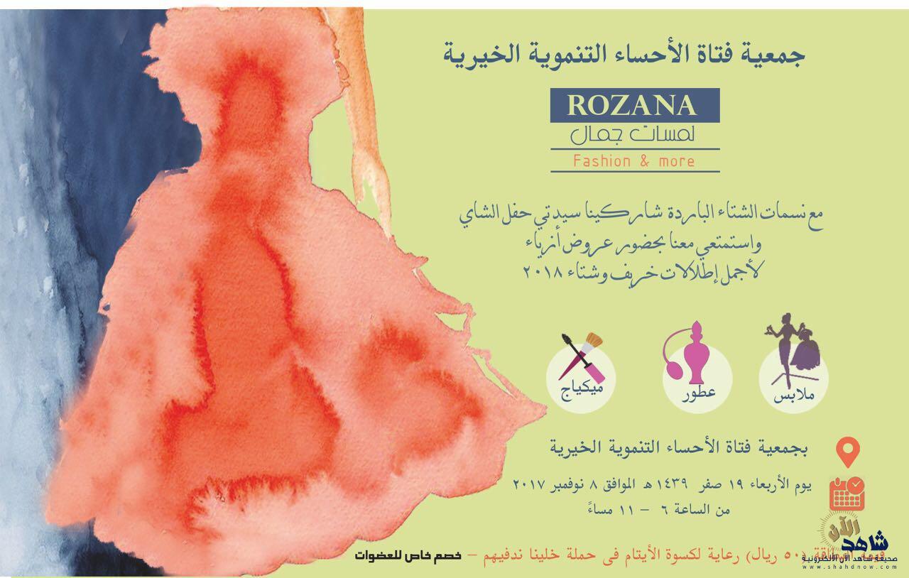 تستعد جمعية فتاة الأحساء التنموية الخيريه خلال الأيام القادمة لإطلاق معرضها السنوي الروزنه ( لمسات جمال ) في نسخته 12 في مقرها ولمدة يوم واحد ويشتمل معرض الروزنه على عرض ازياء نسائي لأجمل إطلالات خريف وشتاء 2017م واركان للبيع لأرقى مصممات الخليج.