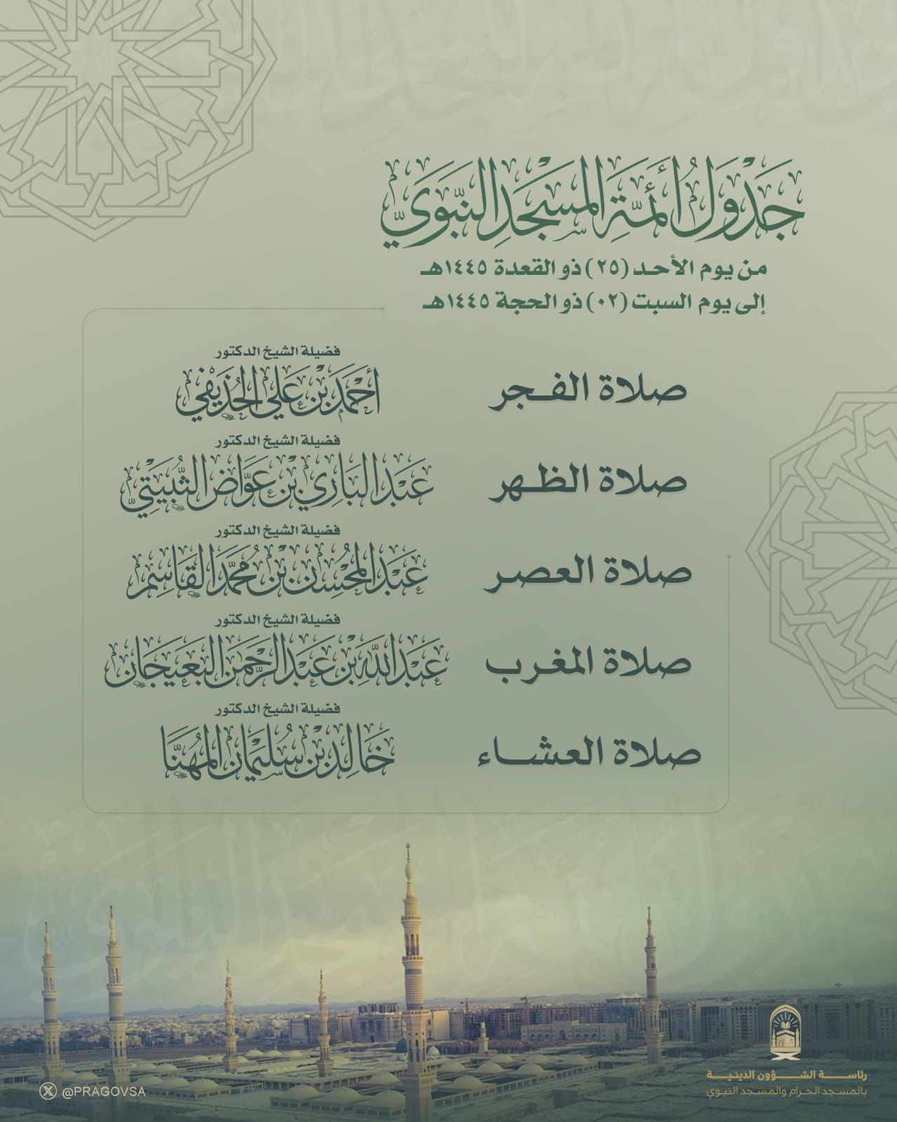 سيكون أئمة المسجد النبوي حسب الجدول التالي: