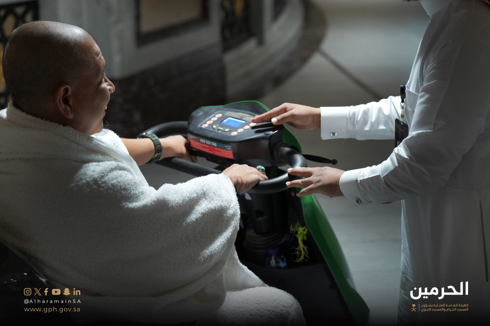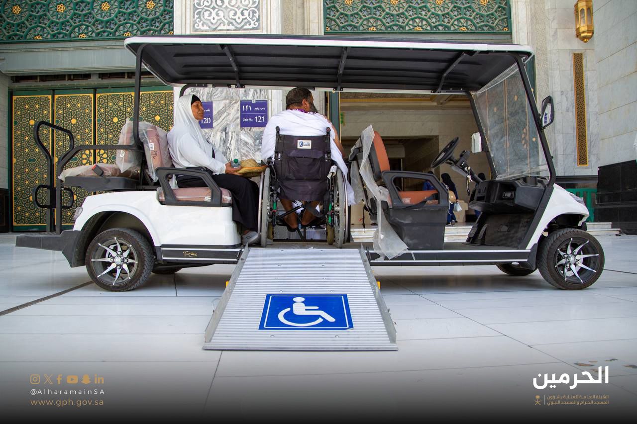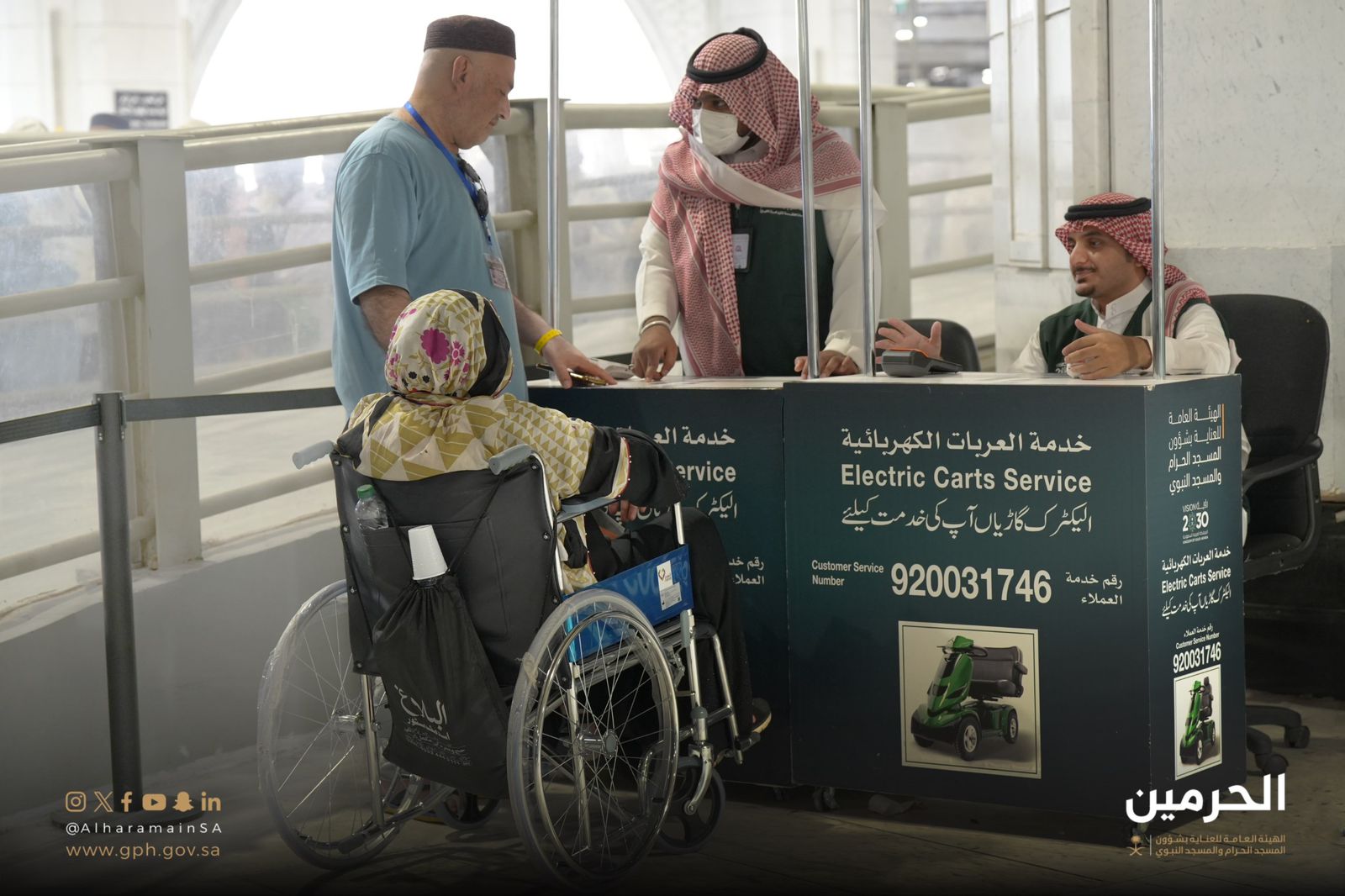 فتبدأ العناية بهم منذ وصولهم إلى المسجد الحرام حيث وفرت الهيئة العامة نقلا تردديا للأشخاص ذوي الإعاقة وكبار السن وهي عربات قولف ترددية متواجدة في الساحات الشرقية للمسجد الحرام، يستطيع القاصد الاستفادة منها عبر نقله من وإلى أبواب المسجد الحرام.